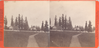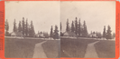 A stereoscope image of residences at Vancouver Barracks, taken from a slight distance. The photographer seems to be standing on a path, which leads towards the two-story, wooden homes. Tall evergreen trees stand behind and around the homes.