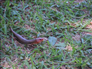 You can probably tell from the photo that the broad-headed skin's common name stems from its wide jaws, giving the head a triangular appearance. This bright orange head is exhibited by males during breeding season. Females have five light stripes running down the back and the tail, similar in apperance to the five-lined skink. Juveniles are also striped but have blue tails as well.