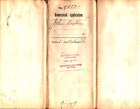 Yellowing scanned Homesteading case file. Transcribed text from the scan is found in the image description. Shadowing shows where the document was folded in three parts horizontally.