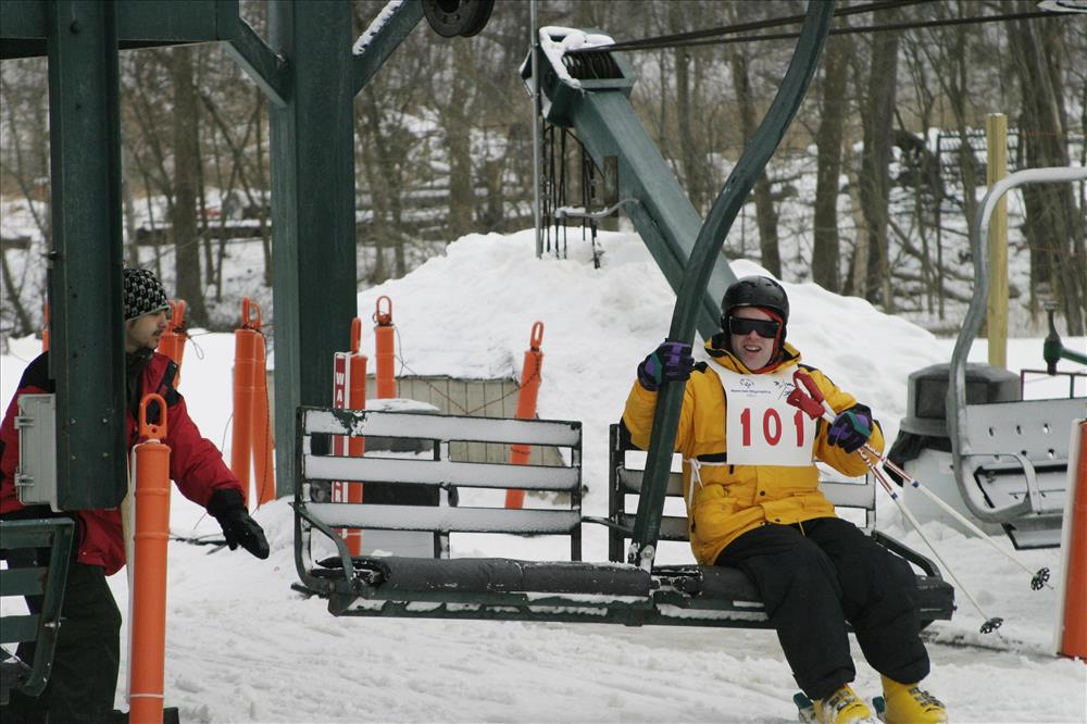 Athletes compete in downhill skiing events at Bradywine Ski Resort in Cuyahoga Valley National Park. These photos feature the athletes on the chairlift. || 2007 was the 25th anniversary of Cuyahoga Valley National Park and Special Olympics Ohio partnering to offer the Ohio Winter Special Olympics. Skiing events are held within the national park. Ice skating events are at Kent State Ice Arena. Special Olympics is an international organization dedicated to empowing individuals with intellectual disabilities to become productive, physically fit, and respected members of society through sports training and competition.