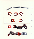 1) rolled nickel-steel rods (from 3/4-inch to 4-3/4 inch in diameter) are cut into shorter bars; 2) the cut bars are heated in a gas furnace to 2100 degrees Fahrenheit. The now-malleable bars are bent by machine into U-shapes; 3) The U-bars are stamped to form stems, with tapered and ridged ends, or they have holes punched in the ends to form sockets; 4) the stem is hooked onto the last completed link and placed in a die; the socket is heated, and the two are joined under a 10,000-pound hammer; 5) the link is completed and a red undercoat and grey paint helps retard rusting.