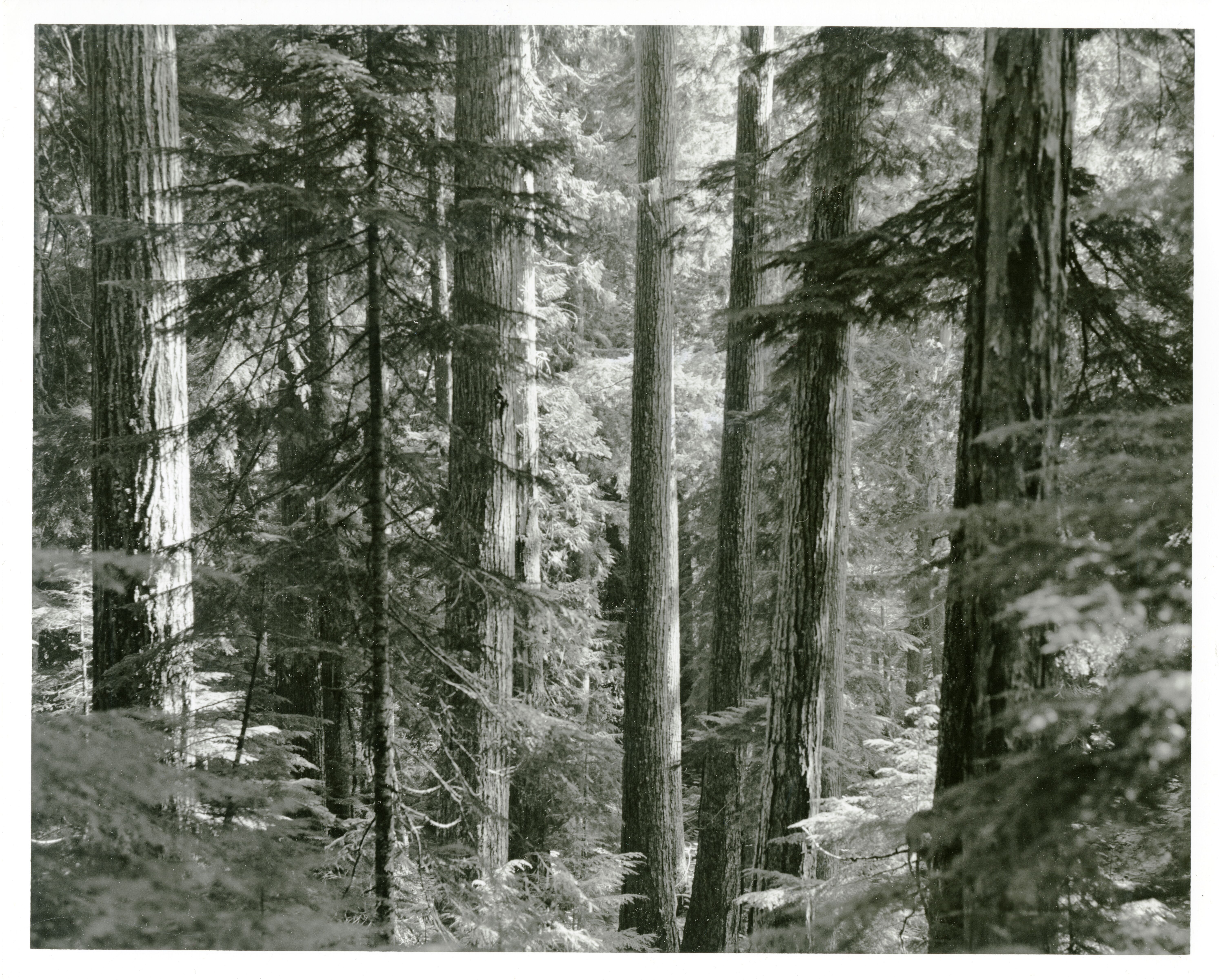 Closeup of old-growth forest containing Douglas fir & other conifers. (North Cascades NPS Complex Museum Collection, NOCA.0002 Assembled Collections, Series V: 1963 NPS North Cascades Survey Photographs, Subseries A: Prints and Negatives, File 043)