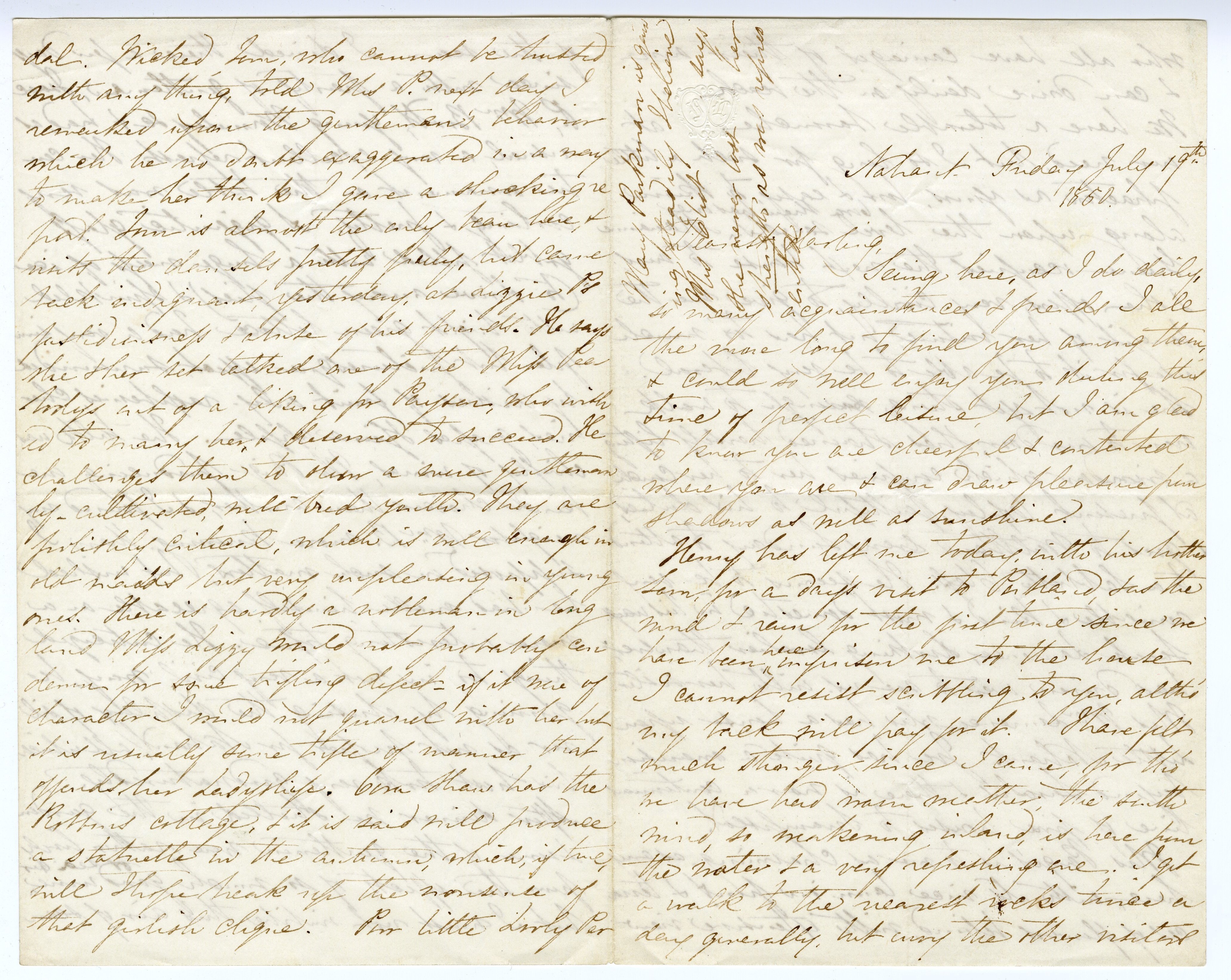 Mrs Paige’s is to me as charming as any her with its nice lawn in front & terraces of flowers behind, with extensive view [p. 3] of the sea. I dined there a few days since with a party of gentlemen, Isaac P., Wm Boott, young Wormley &c & had, as usual, a very excellent repast. Her centre ornament on the table was very cooling & pretty. A gigantic glass goblet filled with a huge mass of ice (to drive away the flies) * sprinkled with bright green lettuce had a very simple but picturesque effect, surrounded by dishes of fruit only – raspberries, cherries, grapes & fine apple. The talk was chiefly of wines, Mr Paige producing one kind choicer than another, & I found my neighbor Wm B. more knowing than I supposed on such matters, but wished he had made himself agreeable on a more interesting topic. He criticized things too in not a very civil way, beginning by abusing the display of silver as not proper for Nahant, all which his host took very good naturedly. After dinner we strolled in the garden & some of the gentlemen were rather lively from the effects of so much good wine or sea-air but I must not imbibe this air of scan[p. 4] dal. Wicket Tom, who cannot be trusted with any thing, told Mrs P. next day I remarked upon the gentlemen’s behavior which he no doubt exaggerated in a way to make her think I gave a shocking report. Tom is almost the only beau here, & visits the damsels pretty freely, but came back indignant, yesterday, at Lizzie P’s fastidiousness & abuse of his friends. He says she & her set talked one of the Miss Peabodys out of a liking for Payson, who wished to marry her, & deserved to succeed. He challenges them to show a more gentlemanly – cultivated, well-bred youth. They are foolishly critical, which is well enough in old maids but very unpleasing in young ones. There is hardly a nobleman in England Miss Lizzy would not probably condemn for some trifling defect – if it were of character I would not quarrel with her but it is usually some trifle of manner that offends her Ladyship. Cora Shaw has the Robbins cottage, & it is said will produce a statuette in the autumn, which, if true, will I hope break up the nonsense of that girlish clique. Poor little Louly Per [p. 5] Perkins is now here with her mother Mrs Chadwick, but has really deserved sympathy for the trial she was subjected to. She lived, you know, with her mother-in-law Mrs P. who became so insane that she was the terror of her life, used to wander into her bed room at night, &c – but at last was sent to the Hospital. Is not this a sad end for such a pleasing little woman as she once was. George Cabots death is very shocking tho’ not supposed intentional. It was his habit after a debauch to quiet his nerves with laudanum, & this once took too much was found insensible & taken to his father’s house, where he died. Tis a dreadful termination of a life, once so promising, still to his father it must be a cessation of constant shame & anxiety. Mrs Kirkland, who was very fond of him, takes it more to heart I hear than even her husband’s death. The Lawrence pamphlet is another matter of gossip, all agreeing it was too bad to be published, & that Bigelow L. was not blameless in thinking it in the hands of editors [p. 6] even for his own justification as he says, tho’ not wishing it printed, in detail. What a specimen of Western manners & education – what a mother! I can well believe Mrs Abbot must have been aggravating enough to such a woman. Could anything be more unfortunate than bringing such a spoiled belle to Boston! I am afraid their shame at this exposure will be swallowed up in indignation at the unmanliness of publishing private letters. It is a sad scandal to go to England. Sumner was here last Sunday (having come down to pass it with Mrs Story, but dining with us) & showed me a letter from Howe written just before arriving. He lamented Miss Wadsworths sufferings, & seemed to think she had been advised to take too much medicine. He tried going without any, & with great care in diet & was perfectly well tho’ usually a victim. He quite disenchanted poor Sumner about Miss Hays by saying she smoked, drank brandy & water (but so do many fair [p. 7] ladies at sea & English everywhere) & worse than all showed herself rather unamiable, taking up Twizzleton in a sharp way! I never thought her quite a lady, tho’ very clever & handsome and have observed a tinge of bitterness, perhaps from loss of fortune & consequently loss of caste in England. Sumner said the cigars & brandy he could endure, but not the tart temper. Mary was to leave London for Wales, but as we have not yet heard of her doing so I hope Lizzy found her there. Such a passage must have been very dismal upon the sadness with which she left, & I long to hear her after-experiences were more cheerful. I have not yet seen Mary (Tom) Dwight but intend very soon when I return calls at her end of the promontory, to visit her. I feel deeply for her unspeakable affliction. How every door is marked with a cross as Morgiana marked them in the Early [???], or for a less vulgar simile the angel of death, as in Egypt, bears away a child from every household. Opposite [p. 8] me is another mourning matter, Maria Austin that was, with one little girl left. There are 8 children in the house where she is. Charles Masons & Mrs Robert Appleton’s who has one named Fanny Elizabeth, a repetition of me which I hope will improve upon the original. Mrs Charles Amory is looking as fresh & young as ever, but her youngest boy has already outgrown his curls & short trousers, & her eldest is talking of a frock coat! To see the children here one feels aged indeed. Mrs Sam Ward is just upon the beach, too far for me to walk, so I have not seen much of her. Mrs Felton’s younger sister Carry Cary is engaged to Pelham Custis – so she has escaped a Professor, her great dread.