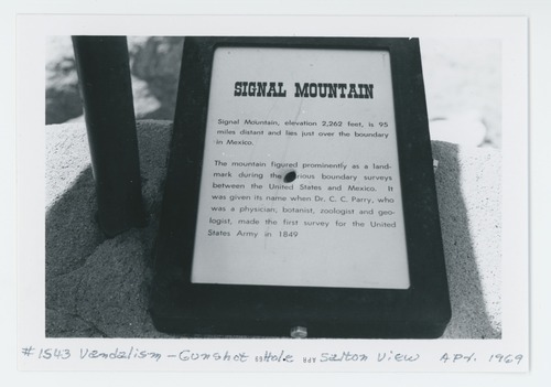 Vandalism. Gunshot hole in sign.