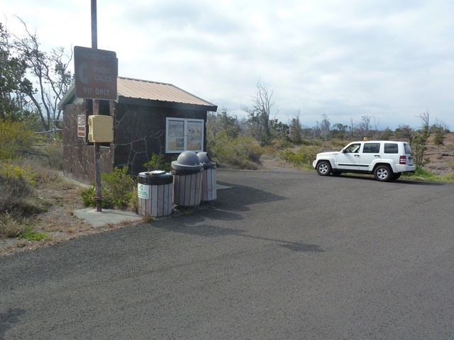 Photograph shows the emergency telephone located at Kulanaokuaiki Camping Facility, Hawai'i Volcanoes National Park: the placement of the emergency telephone does not comply with Accessibility Guidelines for Outdoor Developed Areas.