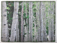 Many white-barked Aspen trees stretch from top to bottom of the quilt, showing neither their canopies or roots. Green leaves and pine needles from surrounding trees fill the spaces between the aspen. Visible stitching surrounds the rectangular quilt.