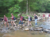 group wading across a creek