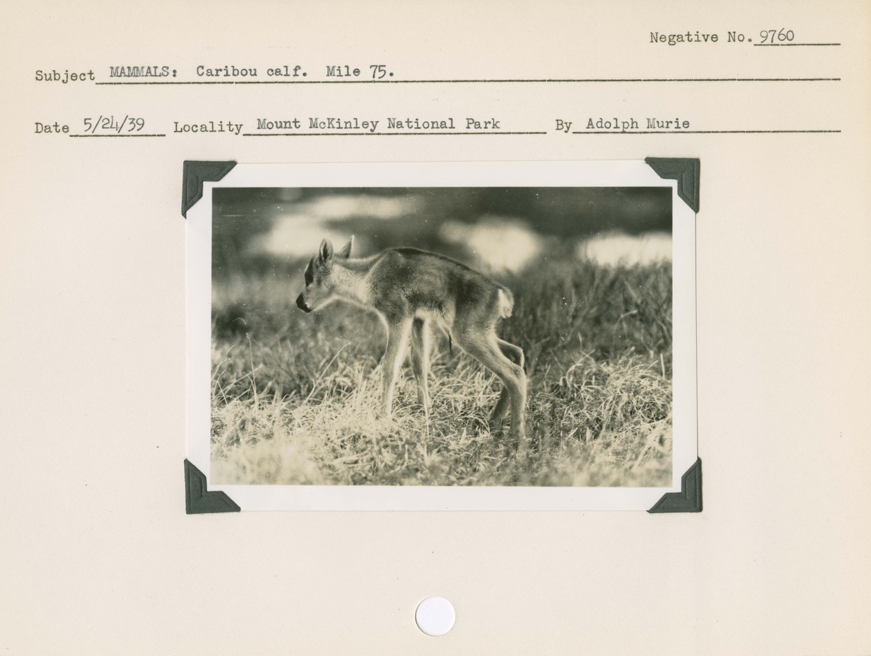 Mammals: Caribou calf. Mile 75. Locality: Mount McKinley [Denali] National Park. Negative #: 9760.
