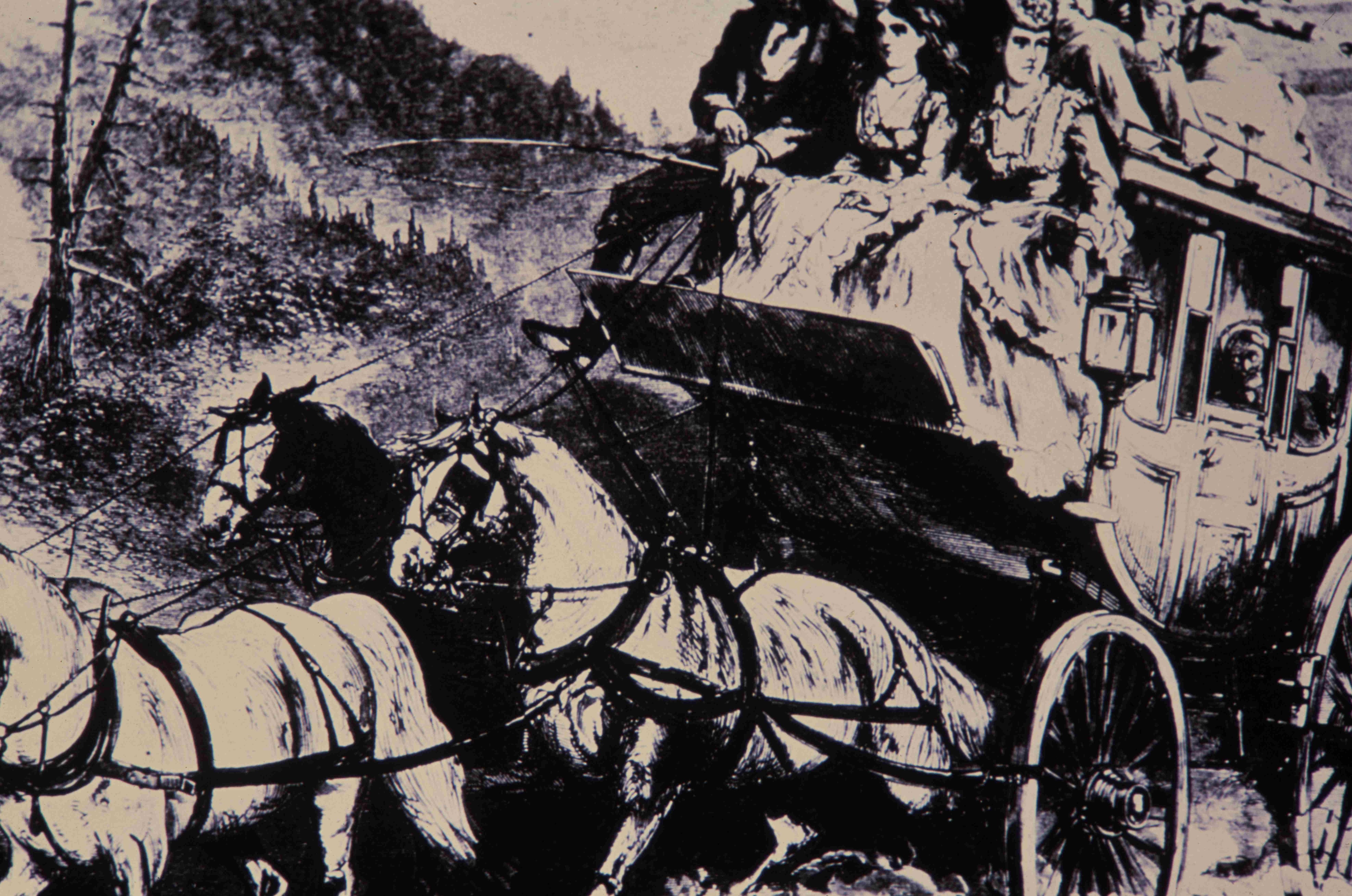 Drawing of people riding on a stagecoach at Fort Smith National Historic Site.