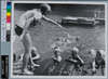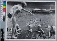 PEOPLE. B&W. TOPIC:PEOPLE CAMP 5.<CRDEPICTS:WOMAN IN T-SHIRT GIVES SWIMMING LESSONS AT DOCK.<CRIDENTIFIER:4 GIRLS AT DOCK. PHOTO CREDIT:ROTTIER 1968 11026-D.<CR<CR<CRCATALOG NUMBER ON BACK OF PRINT. GLOVES REQUIRED IN HANDLING.