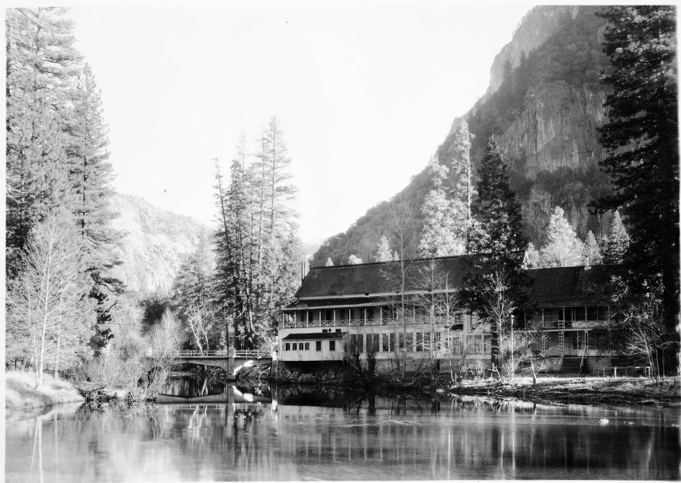 Yosemite, 1915. Sentinel Hotel and River Cottage in old Village.