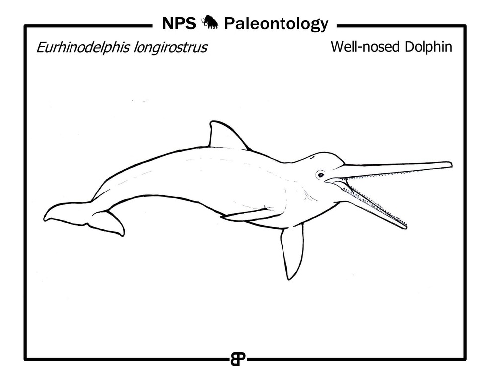 "Eurhinodelphis longirostrus" is a primitive long nosed dolphin. This animal lived during the Miocene. Fossils of "Eurhinodelphis" have been found at George Washington Birthplace National Monument, Virginia.