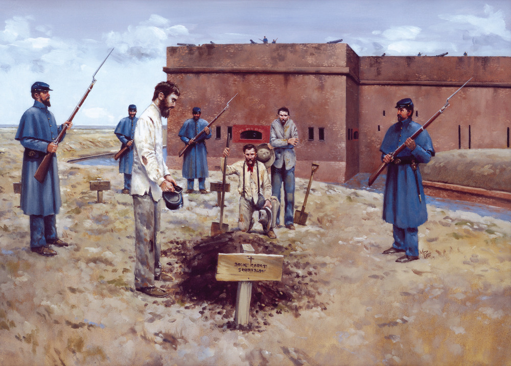 A Martin Pate painting of a burial service for a member of the Immortal 600, the approximately 500 Confederate officers held as prisoners of war at Fort Pulaski from October 1864 to March 1865. Thirteen Confederate officers died of disease while at Fort Pulaski and remain buried just outside the fort to this day.