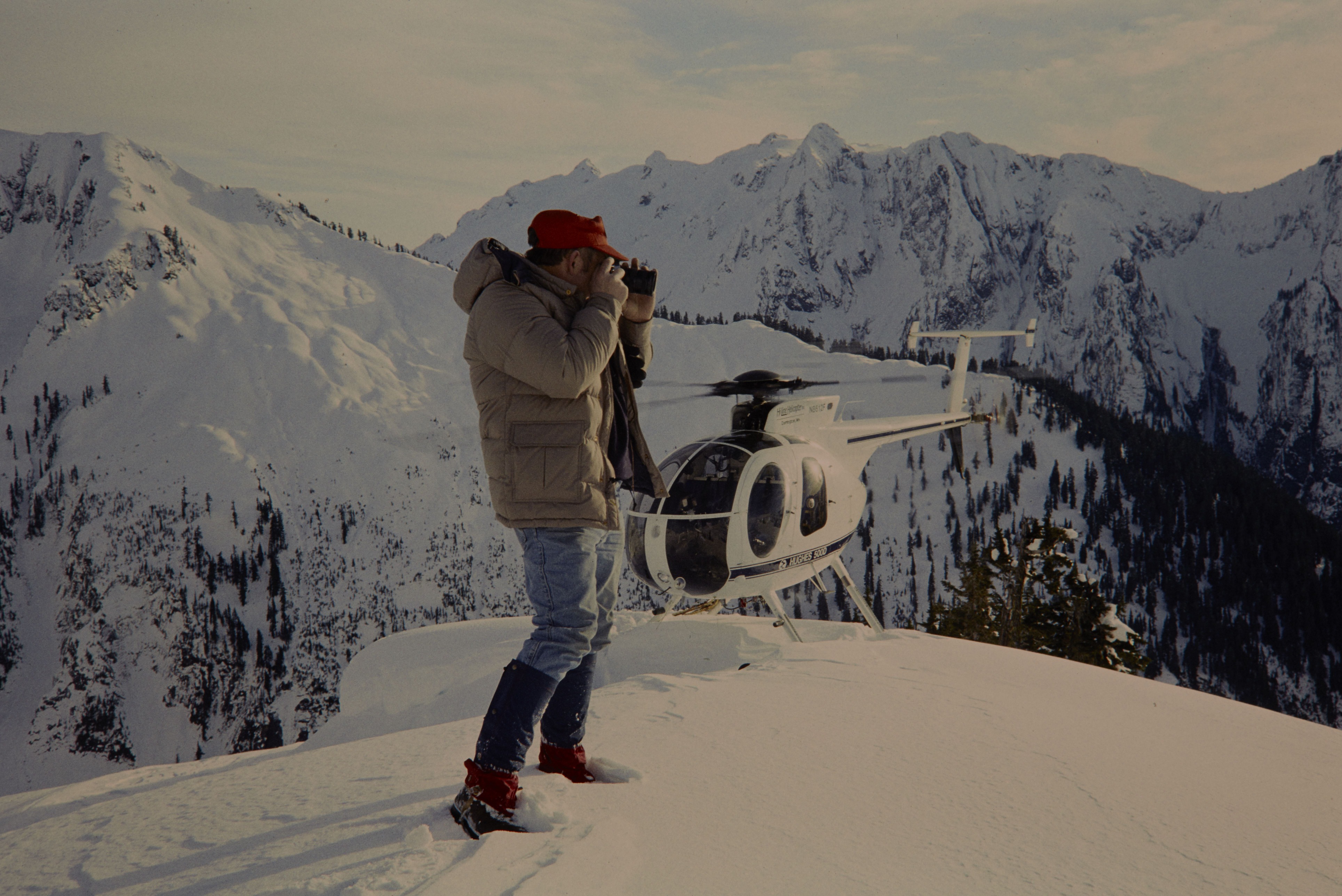 Man taking photos on top of a snow covered mountain with a helicopter behind him in North Cascades National Park.
