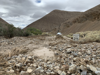 Debris completely covers a paved road near Wildrose Campground in Death Valley National Park.