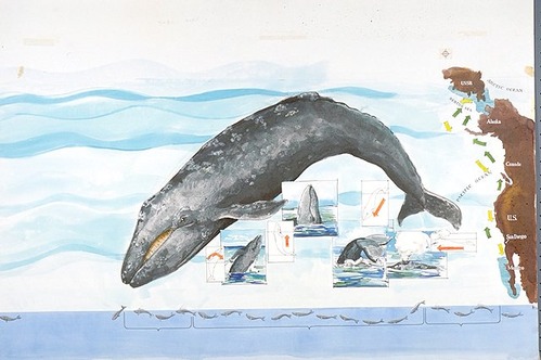 Split panel art montage depicts a Pacific (California) gray whale under water;
