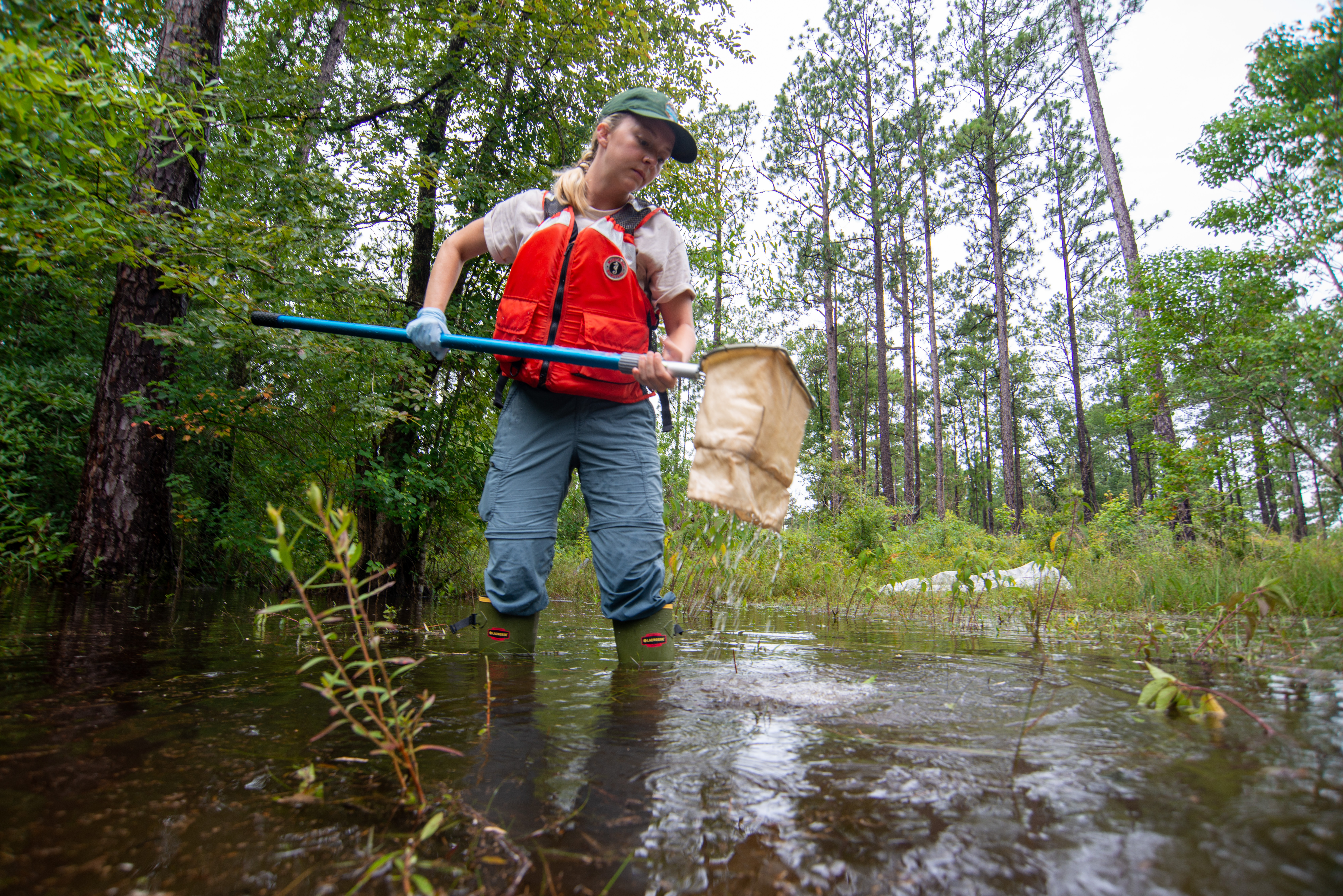 A scientist wearing an orange vest and carrying a long dip net while standing in a freshwater pond in the woods.