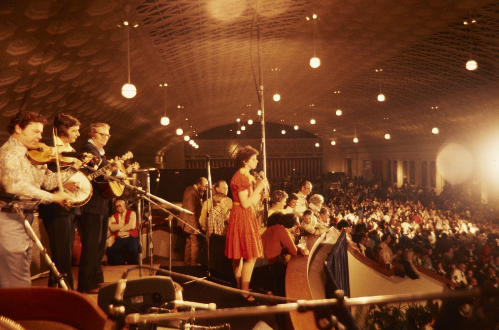 Musicians consisting of a fiddler, banjo player, guitarist, and a singer, performing on stage in Union Station in Washington, D.C.