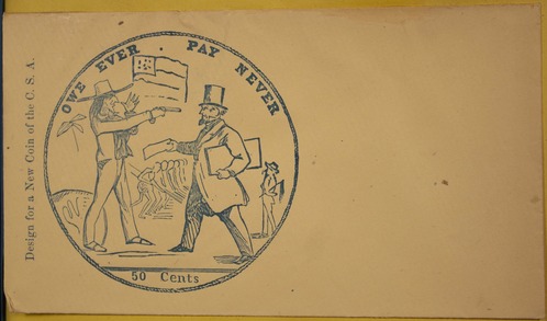 Political cartoon of plantation owner about to shoot northern banker when he tries to collect a loan, "Owe ever. Pay never".