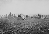 Black and white photograph of approximately fifty people, mostly sitting, looking away from the camera into a large cloud of steam. The crowd is formed in a loose horizontal line across the middle of the photograph. The bottom half of the photo is rocky ground. The top half of the image is almost entirely steam. “Tai Sing Loo, D” is written in the bottom left corner.