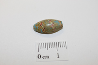 Greenish-Blue, ellipsoidal, furnace-wound and shaped bead with inlaid complex twisted spiral stripe. According to Lester A. Ross, author of Trade Beads from Archeological Excavations at Fort Union Trading Post National Historic Site, “a furnace-wound bead appears to have been manufactured by shaping a glob of molten glass on a wire or rod.”
