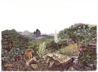 Diorama-like communities of Chaparral growth and wildlife at elevations of 1,000-5,000 feet and Blue oak communities at elevations of 500-2,500 feet Depicted in the illustration are the following species: Manzanita Brown towhee, Retailed hawk, Lark sparrow, Coyote, California buckeye, Southern alligator lizard, California quail, Scrub jay, Chamise, Redbud, Yucca, Western fence lizard, Turkey vulture, Blue oak, Mule deer, Harlequin lupine, Gray fox, California ground squirrel, Black bear, Acorn woodpecker, Western rattlesnake, and Poison oak