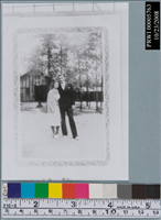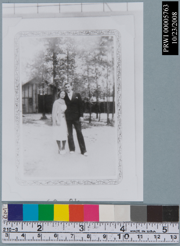 PEOPLE. B&W. JOE HEBDA ALBUM.<CRDEPICTS:MAN AND WOMAN POSED FOR PICTURE.<CRIDENTIFIER:MAN HAS DARK SUIT AND WHITE SHOES. EMBRACING POSE.<CRDUPLICATION OF PHOTOS FROM JOE HEBDA ALBUM.<CR#5703 TO 5769 ARE FROM ALBUM.<CRCATALOG NUMBER ON BACK OF PRINT. GLOVES REQUIRED IN HANDLING.