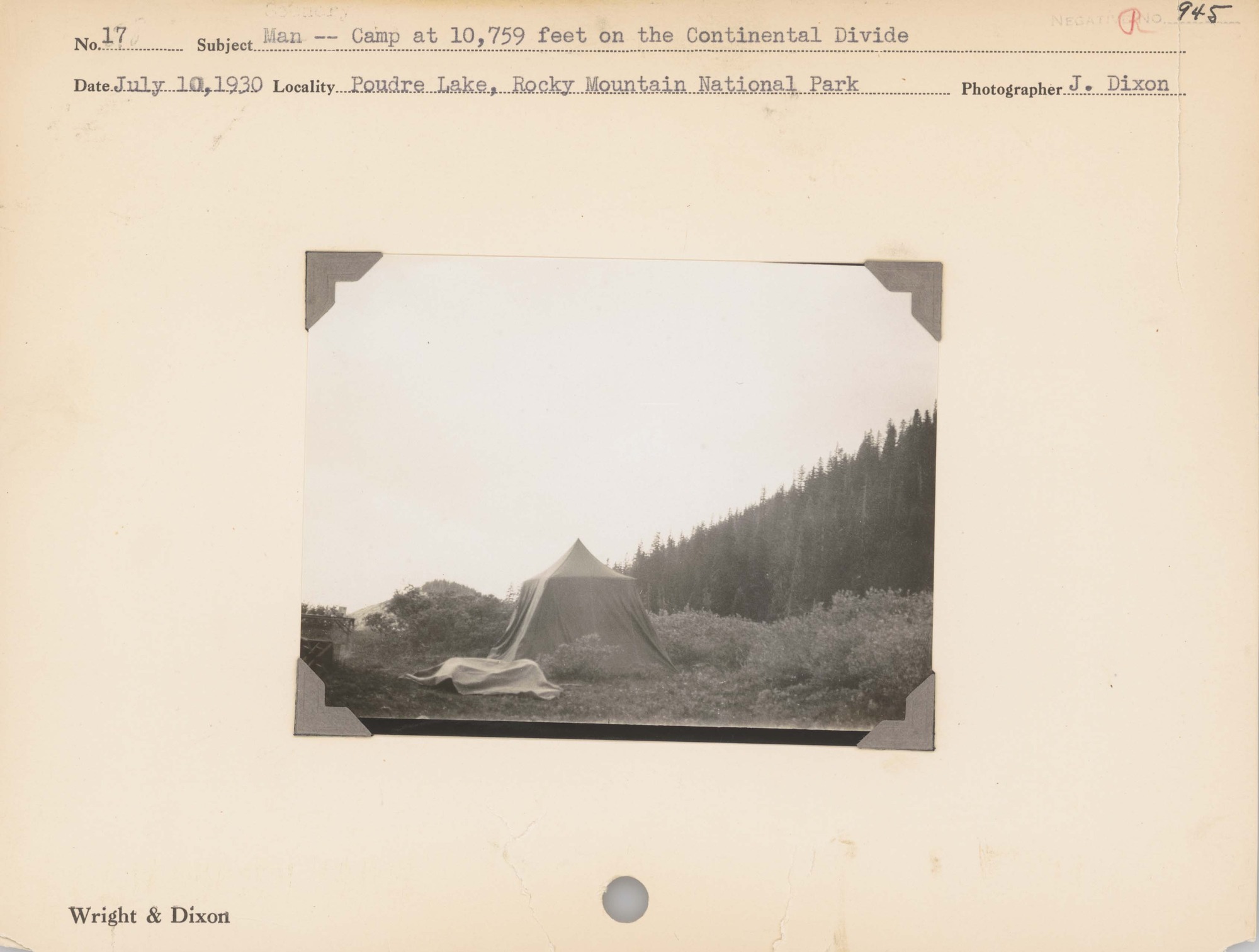 Man--Camp at 10,759 feet on the Continental Divide. Locality: Poudre Lake, Rocky Mountain National Park. Negative #: 945