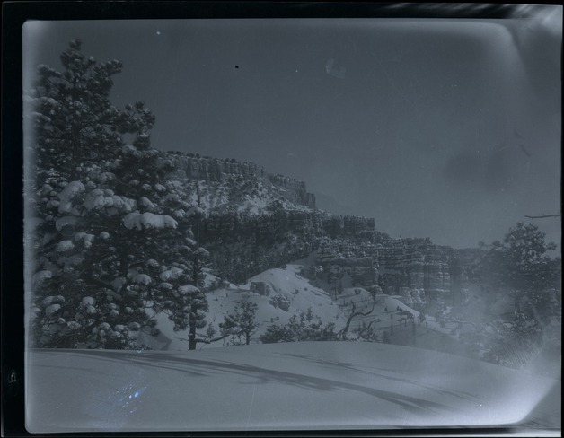 Nitrate negative of snow covered hoodoos and trees from the canyon floor in BRCA. ; BRCA Museum and Archives Image BRCA8875_001_548 ; BRCA 8875