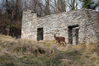 A deer walks out from the doorway of an abandoned stone structure.