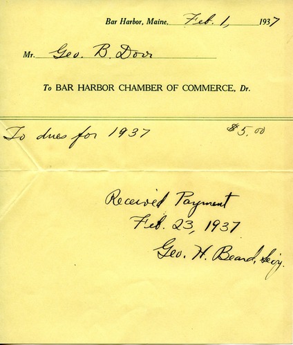 Receipt from Bar Harbor Chamber of Commerce for George. B. Dorr's payment of dues. Signed by George. H. Beard.