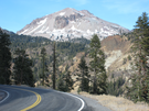 Lassen peak with patches of snow on it rising above the Main Park Road near Little Hot Springs Valley.
