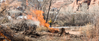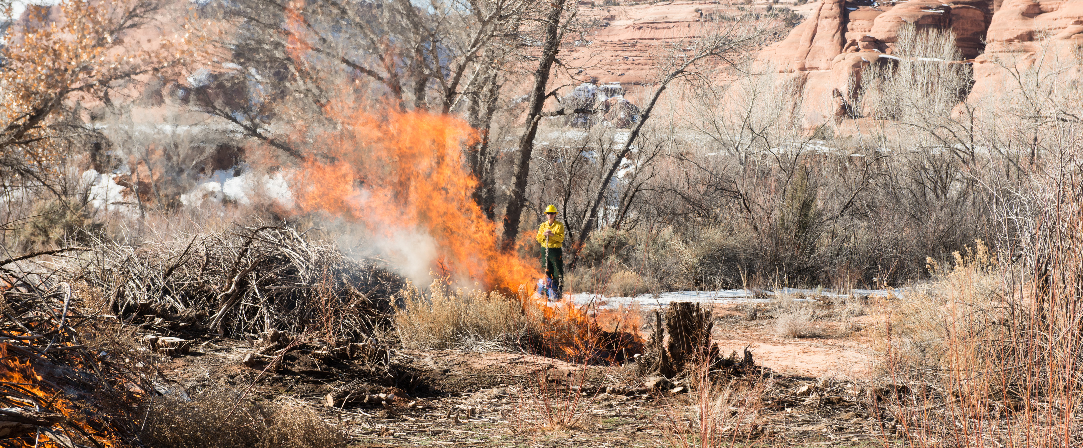 A fire fighter watches a burning vegetation pile in upper Courthouse Wash. These piles are accumulations of plant material from the clearing of exotic species in the park.