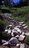 Cascade Pass, Revegetation Site TH1, revegetation monitoring photograph. Text on slide frame reads: "REV/CAS/TH1/d-9, Back entrance to Thx1 (old ranger camp) from below turnoff to Sahale Arm, Late July, 200310/99." (North Cascades NPS Complex Museum Collection, NOCA.0013 Revegetation Program Records, Series XI: Photographs, File 001 - Cascade Pass, Vicinity Impacts and Revegetation Sites, 1970-2004)