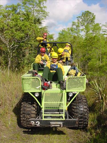 Big Cypress NP uses a variety of vehicles and equipment in managing fire. Here a fire crew is being transported on a swamp buggy.