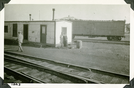 This is an historic black and white photograph from the Scotty's Castle Historic Photograph Collection, Death Valley National Park of two woman standing behind railroad track where trains can switch track in front of white shed with dark trim. Man walking in front of shed to left. Box car on tracks in background. Number in black ink in lower left corner.