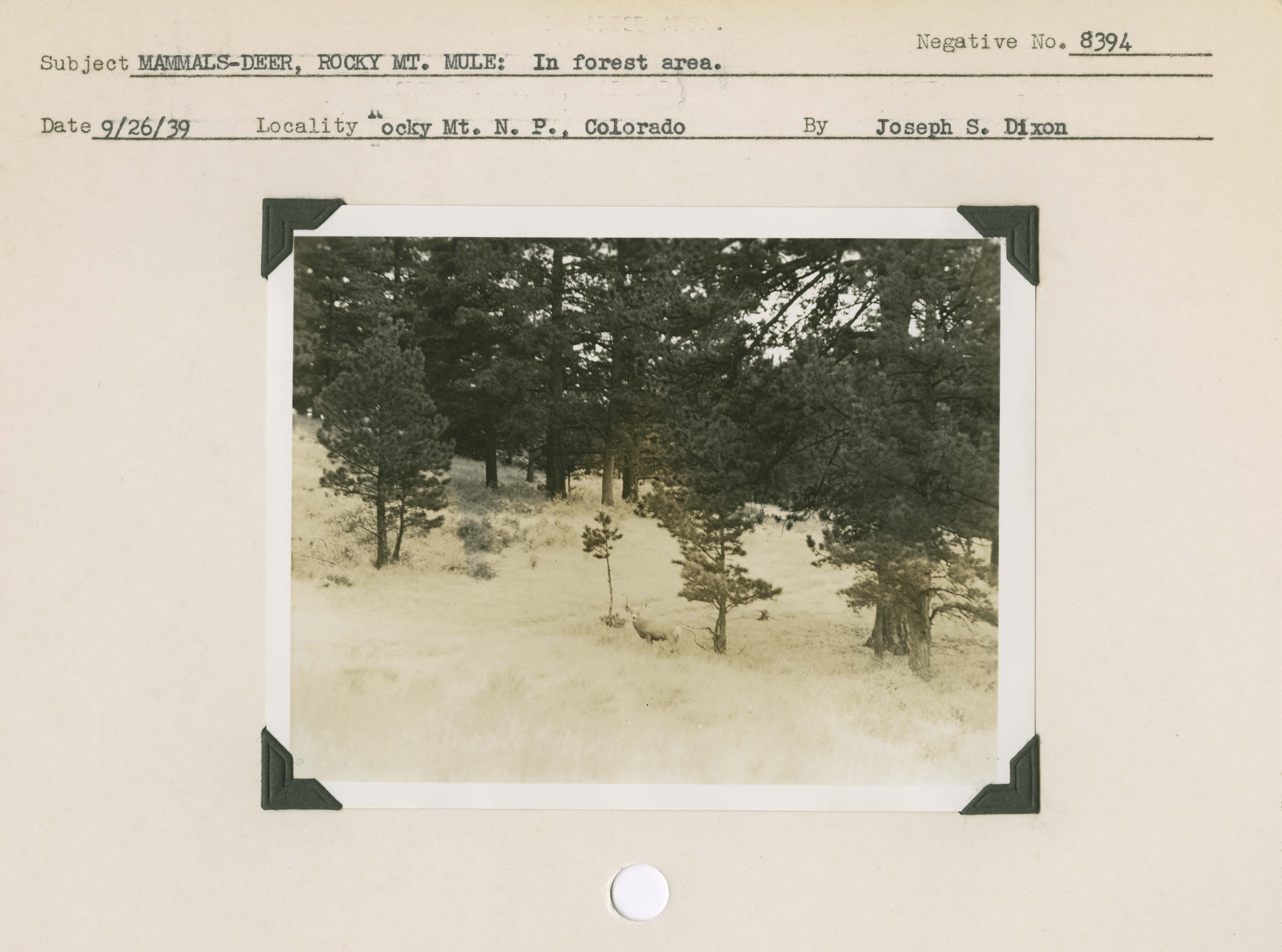 Deer, Rocky Mountain Mule: In forest area. Negative #: 8394. Locality: Rocky Mountain National Park, Colorado.