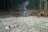 A person stands on a wide gravel river bed at the base of a large landslide cut through a forest.