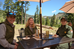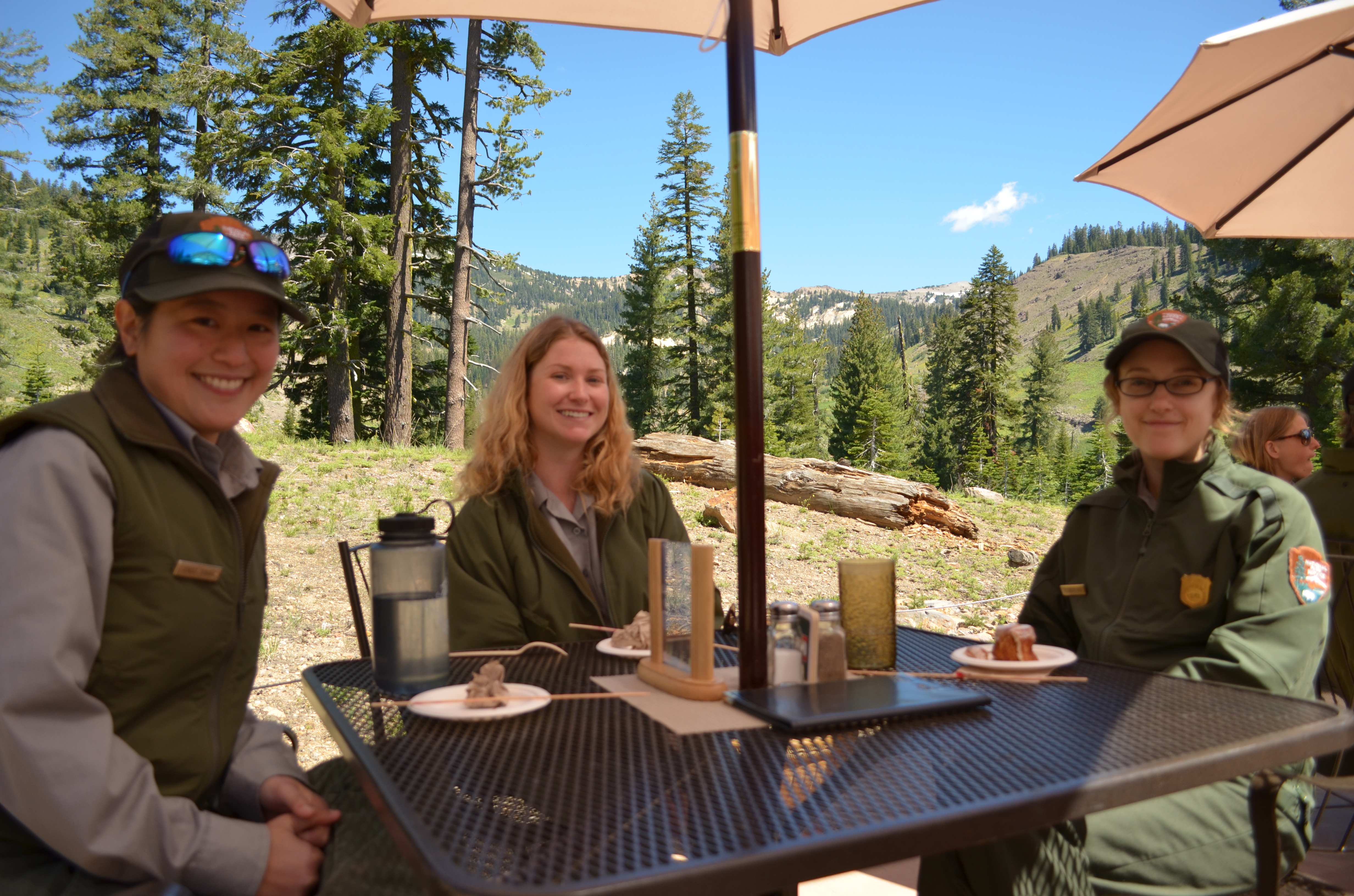 Staff members following staff meeting on the Kohm Yah-mah-nee Visitor Center patio. Elizabeth Hale at right.