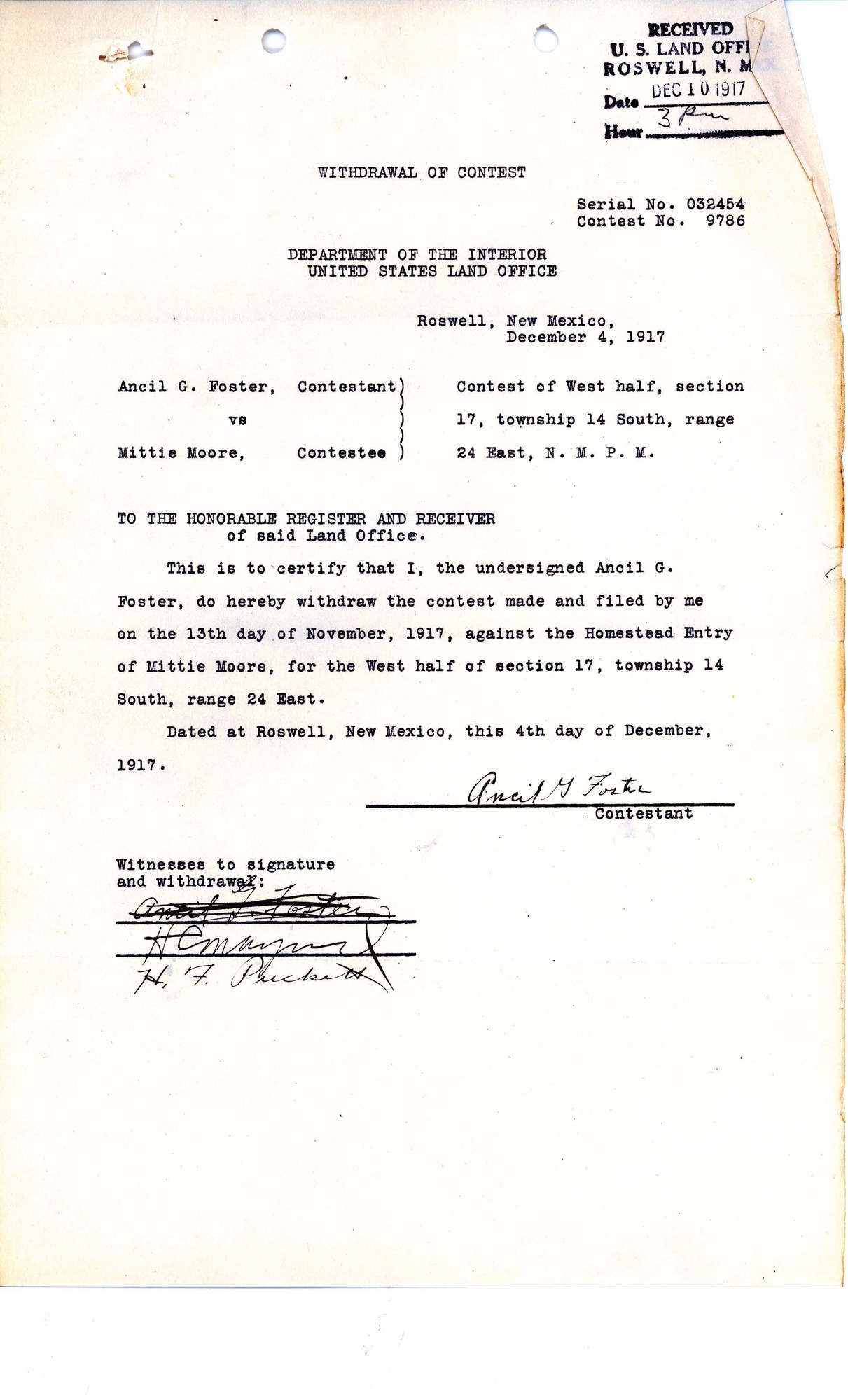 This is to certify that I, the undersigned Ancil G. Foster, do hereby withdraw the contest made and filed by me on the 13th day of November, 1917, against the Homestead Entry of Mittie Moore, for the West Half of section 17, township 14 South, range 24 East.