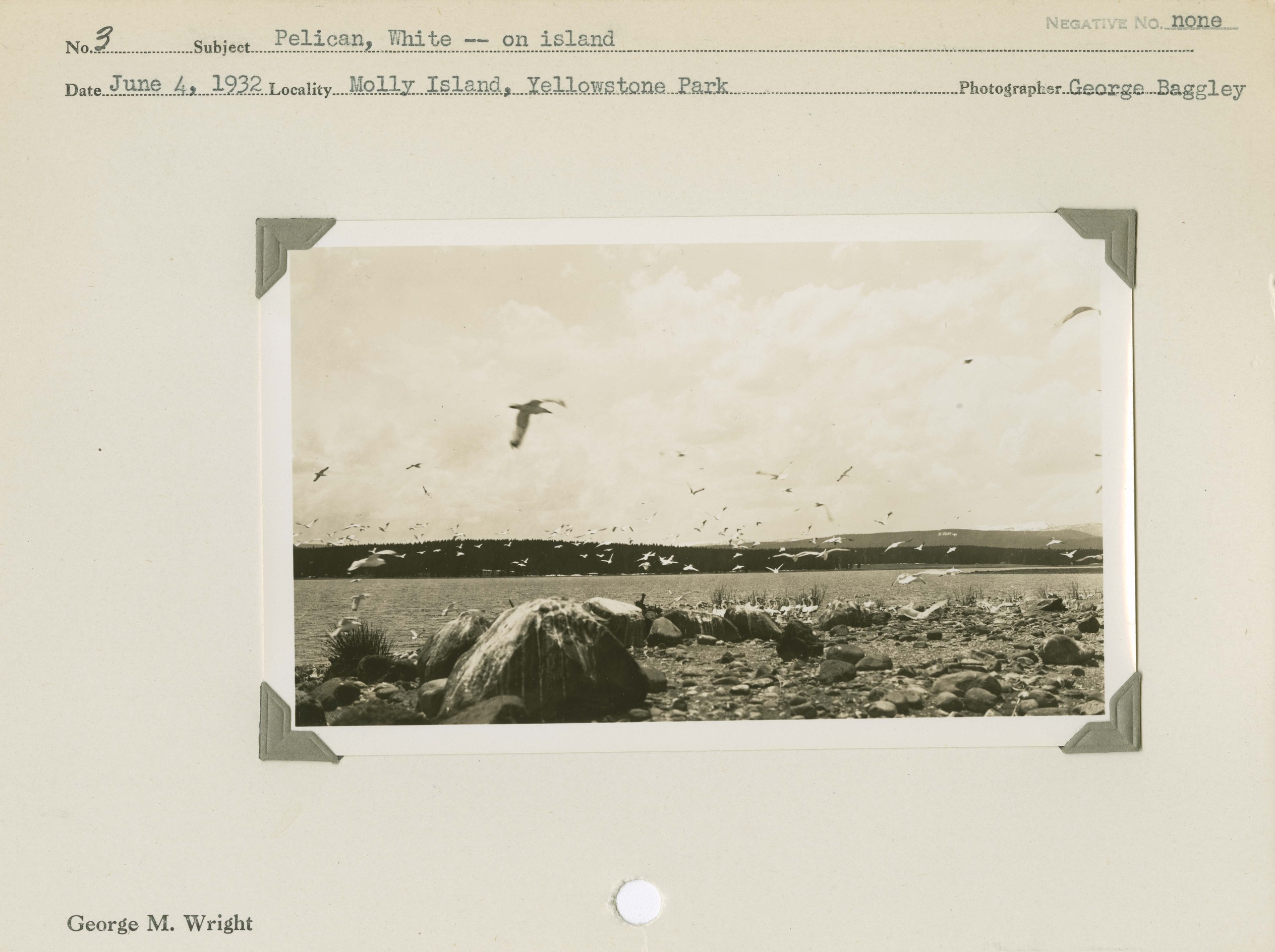 Pelican, White -- on island. Locality: Molly Island, Yellowstone National Park. No negative on file.