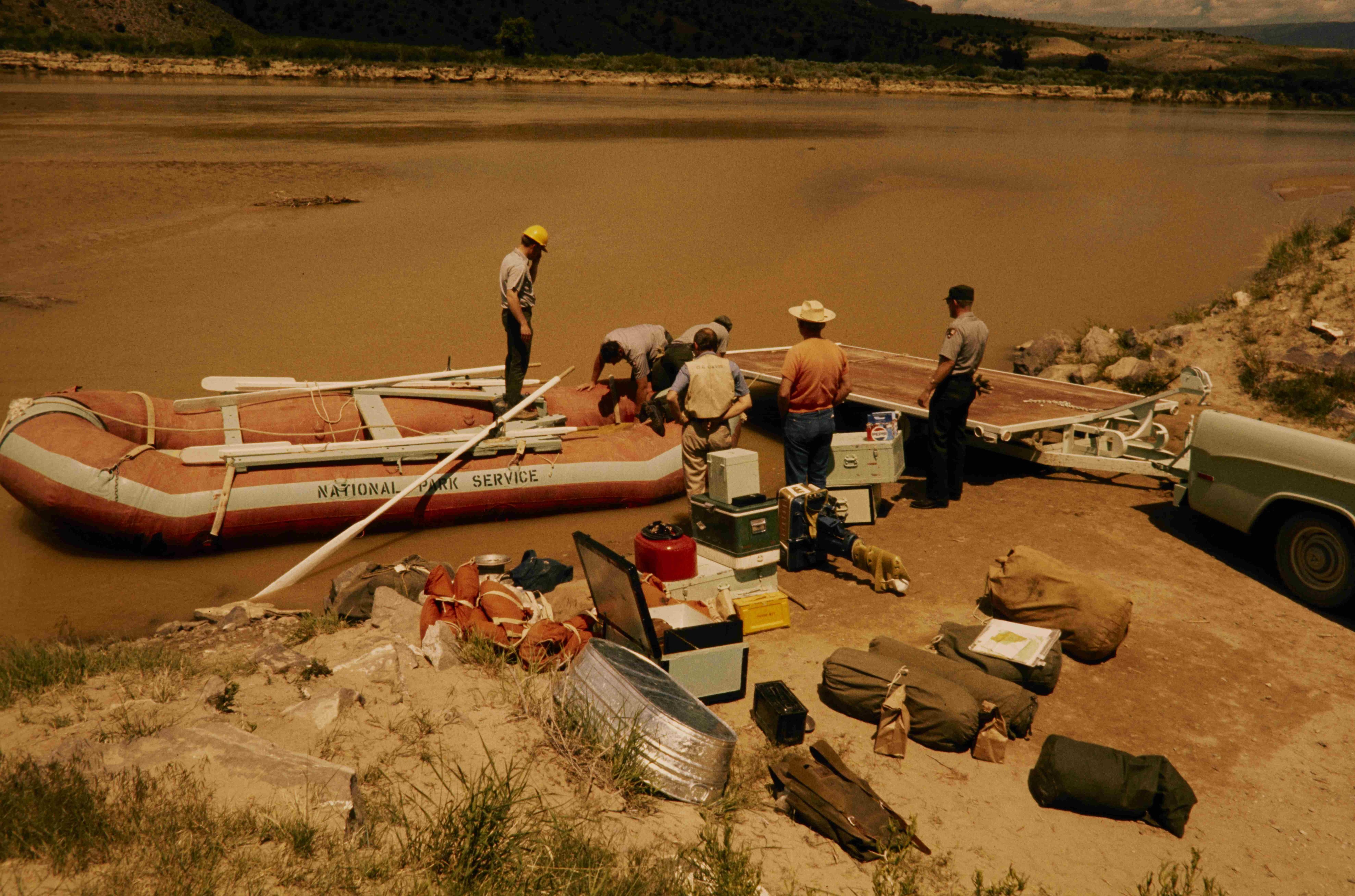 NPS employees loading raft at Gates of Lodore in Dinosaur National Monument.