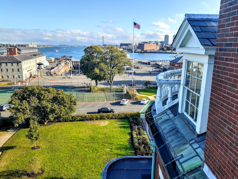 View of the Charlestown Navy Yard from a building with the building along the right side of the photo and the view of the Yard to the left.