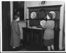 Florentine cupboard, Margaret L. Suckley, a distant relative of the late President Roosevelt, (left), and Nellie V. Noney, both of Rhinebeck, NY., look over a display of China on the Florentine cupboard in the dining room of the Roosevelt home.