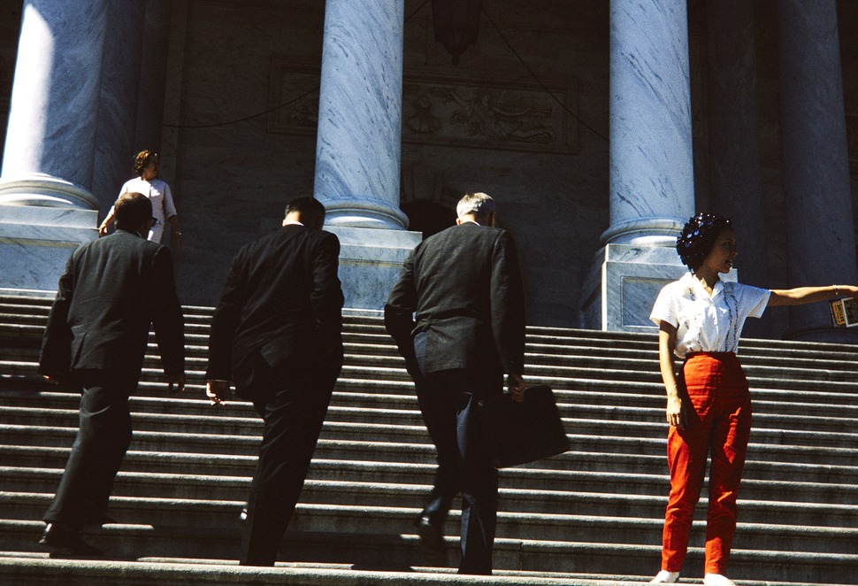 NPS Director George B. Hartzog, Jr. walking up the steps from a building with two men.
