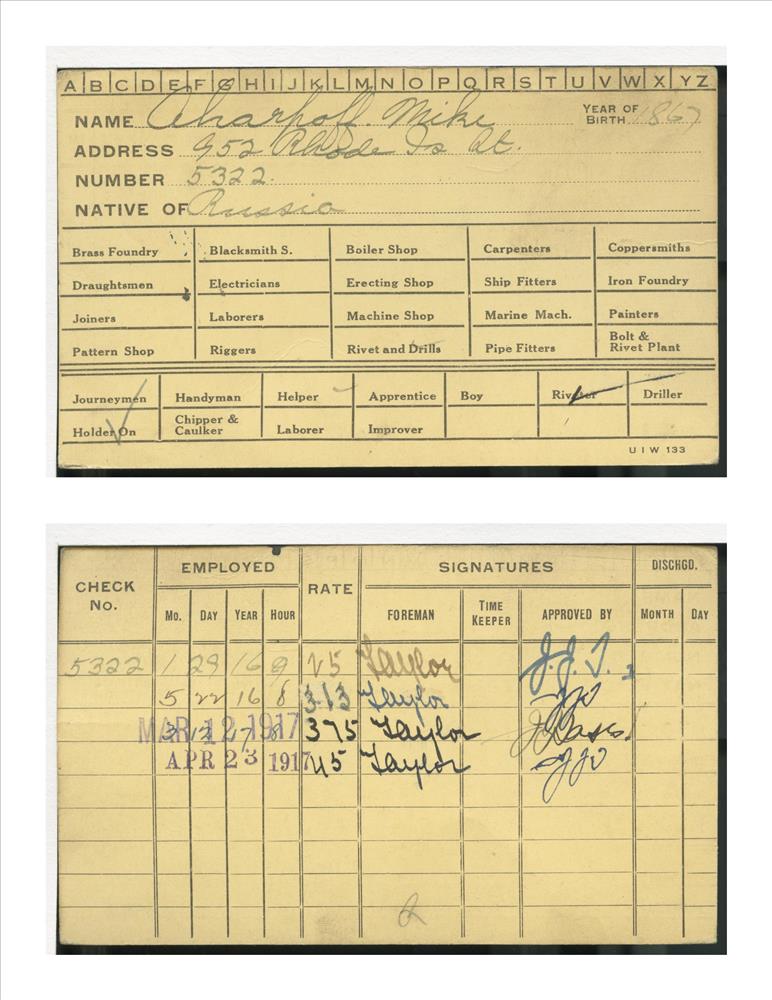 Union Iron Works Co. employee card for Mike Aharpoff