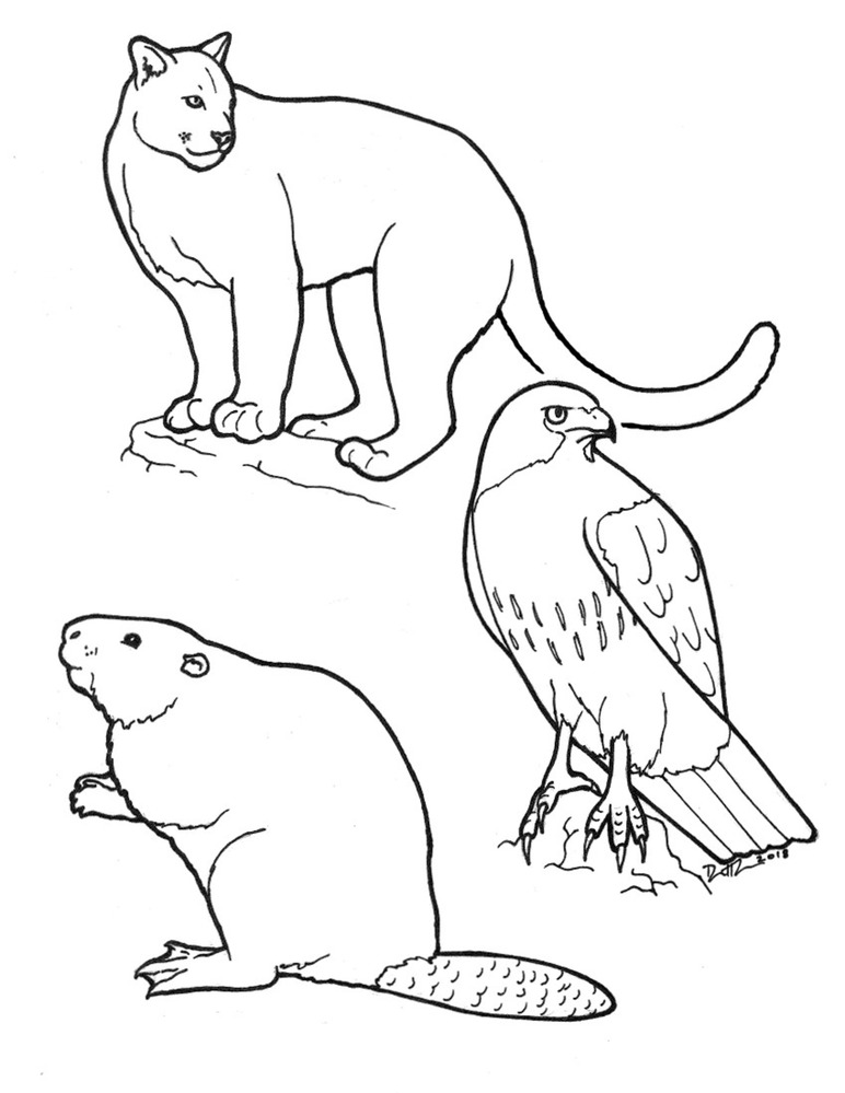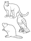 Black line drawing of three animals. On bottom left of page is a drawing of a beaver, which is facing towards the left and raised on two feet. Above the beaver is a hawk, which is facing towards the right. At the top of the page is a mountain lion, who is also facing towards the right.