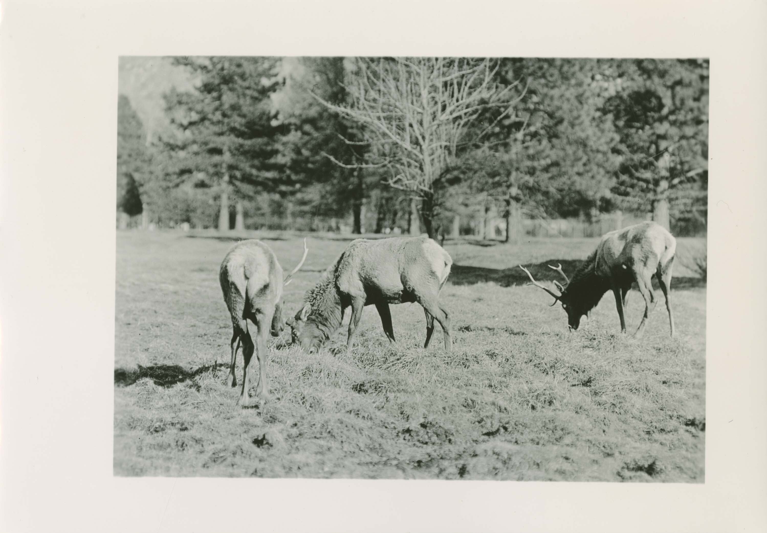Dwarf Elk. Old bull (new antlers growing); and young bull (antlers still on). Negative #: 793. Locality: Yosemite National Park. Location of Negative: Region Four Headquarters. [This information comes from the reverse of the envelope for this negative number].