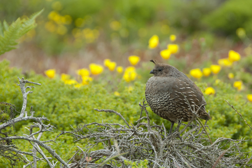 Female california quail perched on a shrub
