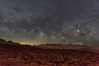 A rocky plain underneath a sky with numerous stars.